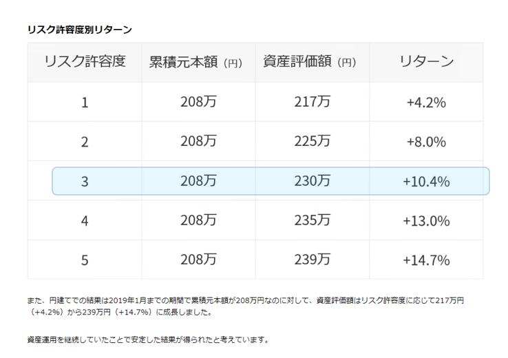 私の場合は 【リスク 3】 なのでリターンは【+10.4% 】の運用になるはずです!?