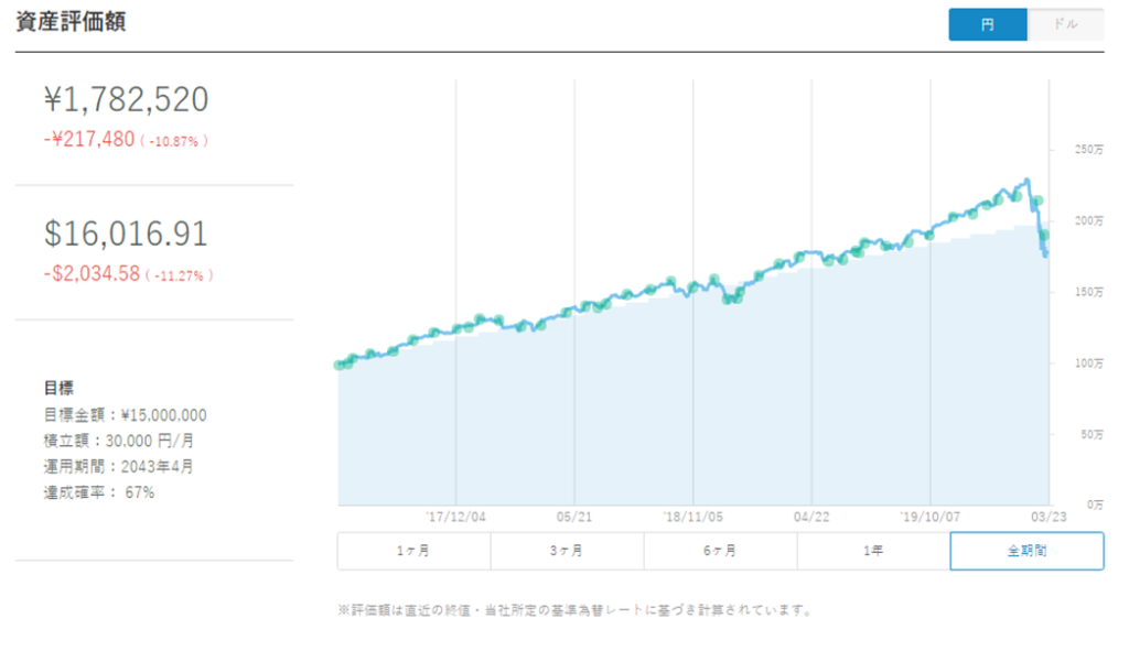 過去に一番マイナスだった時期は 2018 年12 月 中国通信機器大手の副会長がカナダで逮捕され米中の貿易摩擦がヒートアップしてきた時でした。この時 -7.75 % で 12万ほどマイナス。