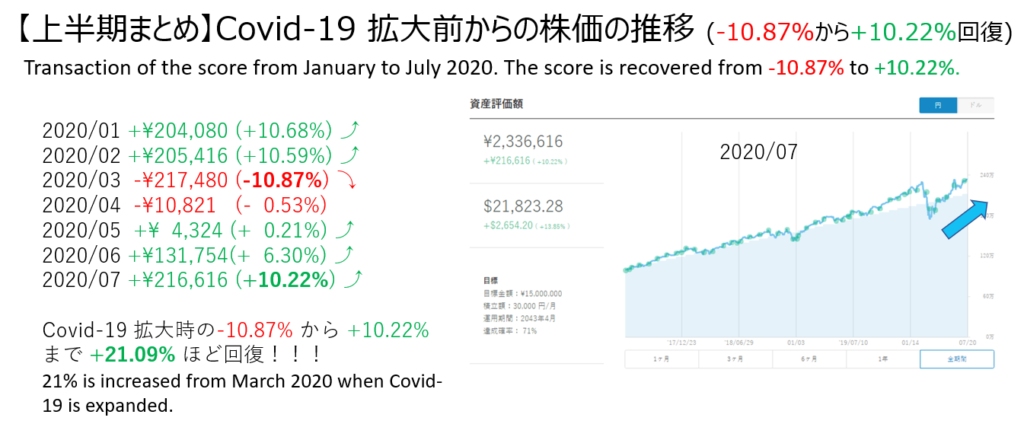 【上半期まとめ】Covid-19 拡大前からの株価の推移 (-10.87%から+10.22%回復)