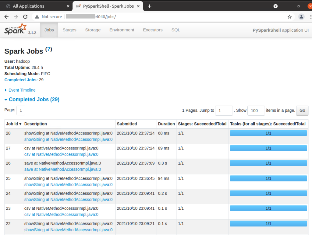 -rw-r--r-- 1 hadoop supergroup 53 2021-10-10 23:37 appbox/sparkdf/part-00000-27c7d2c1-e668-4bb8-98df-f046a580cce1-c000.csv3-5. 最後に、上記 Spark のジョブ実行履歴は以下のように 4040 もしくは 4041 ポートの Spark UI で確認できます。