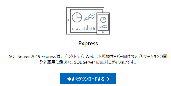(Windows OS) Express の今すぐダウンロードをクリックすると SQL2019-SSEI-Expr.exe がダウンロードされ、クリックするとインストールウィザードが進みます。 https://www.microsoft.com/ja-jp/sql-server/sql-server-downloads