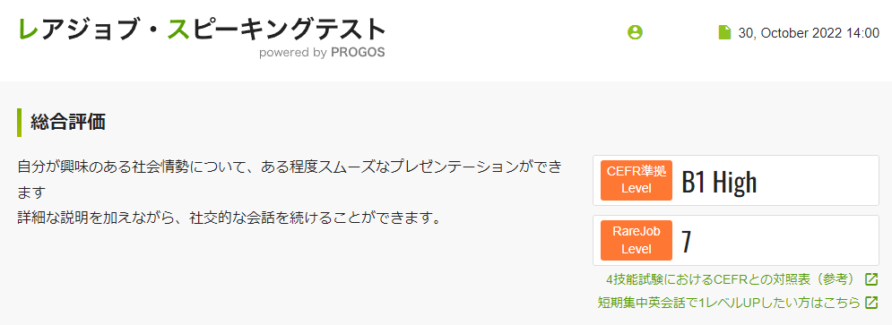 そして今回の【レアジョブのスピーキングテストスコア】 は以下! B1 High!!2 年前から進歩なし。。。